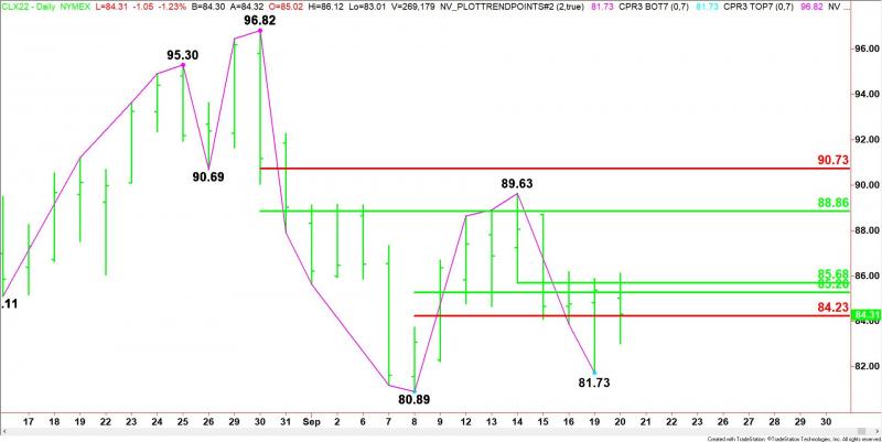 主要趋势是根据每日摆动图下降的。突破80.89美元的交易将重申下降趋势。突破89.63美元将改变主要趋势向上。主要范围是$ 96.82至$ 80.89。其88.86美元的回撤区域是阻力位。它在9月14日阻止了89.63美元的反弹。第一个次要范围是$ 80.89到$ 89.63。市场目前正横跨85.26美元至84.23美元的回撤区。第二个小支点是85.68美元的阻力位。