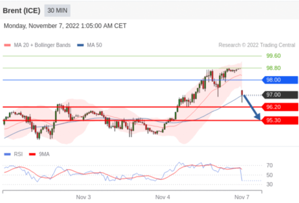交易策略: 在 98.00 之下,看跌,目标价位为 96.20 ,然后为 95.30 。