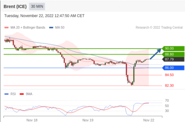 布伦特原油 (ICE) (F3) 当日内交易策略: 在 86.00 之上 目标价位为 88.80(20221122)