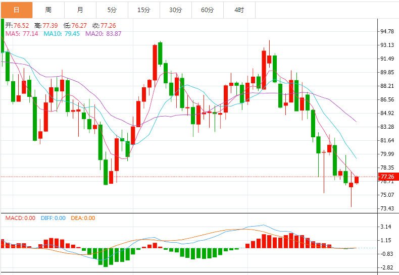 技术上,相对强弱指标处在14近于超买,表明10月18日74.30美元以来的下行倾向支撑成为WTI油价相邻支撑。