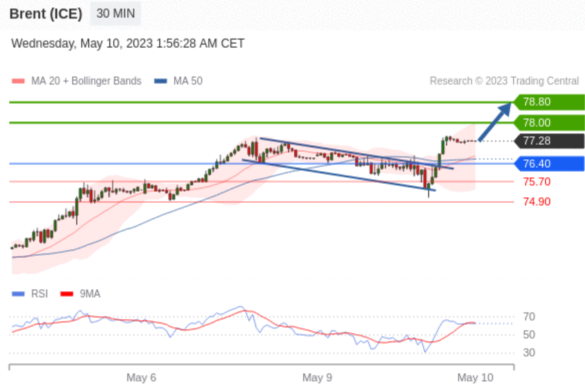 布伦特原油 (ICE) (N3) 当日内交易策略: 在 76.40 之上 目标价位为 78.00(20230510)