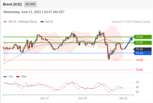 布伦特原油 (ICE) (Q3) 当日内交易策略: 在 75.10 之上 目标价位为 76.00(20230621)