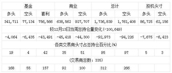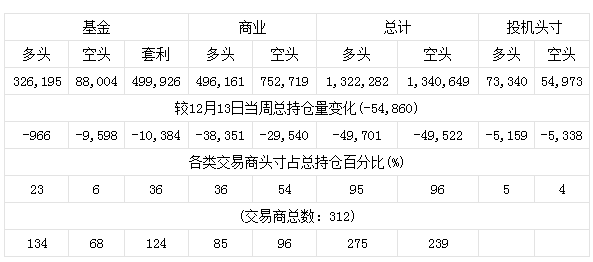 美国商品期货交易委员会(CFTC)最新公布截止12月20日当周NYX原油期货分类持仓报告: 合约单位:1000桶总持仓量:1395622