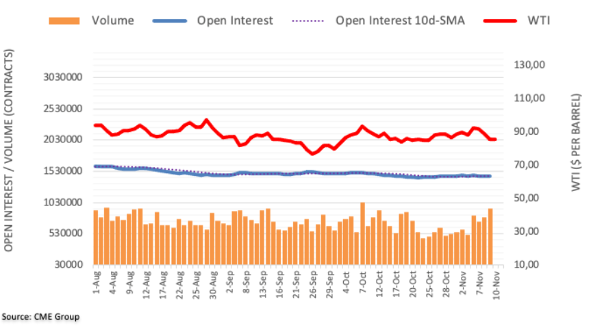 考虑到芝加哥商业交易所集团原油期货市场最新数据,週三交易员增持其未平仓合约近0.43万份,结束两连增。成交量连续第二日增长,此次增长近14.4万份合约。 WTI原油价格可能跌回82.10美元 周三WTI原油价格延续週内跌势,同时未平仓合约和成交量齐增。短期内价格仍可能进一步回落,下一个目标要注意週低点82.10美元(