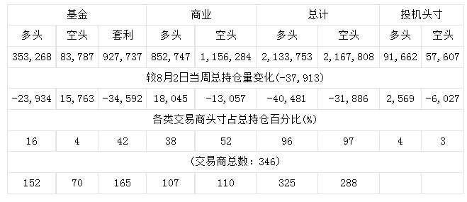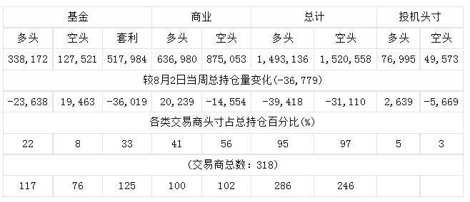美国商品期货交易委员会(CFTC)最新公布截止8月9日当周NYX原油期货分类持仓报告: 合约单位:1000桶总持仓量:1570131