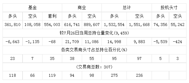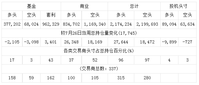 美国商品期货交易委员会(CFTC)最新公布截止8月2日当周NYX原油期货和期权分类持仓报告: 合约单位:1000桶总持仓量:2263328
