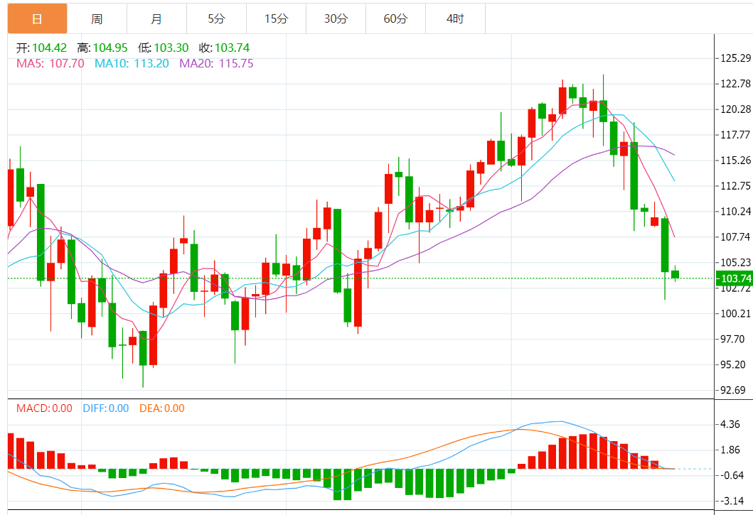 周四,原油期货下挫,因经济和需求前景令人担忧。 WTI原油期货收盘下跌1.8%,报每桶104.27美元。 布伦特原油期货收盘下跌1.5%,报每桶110.05美元。