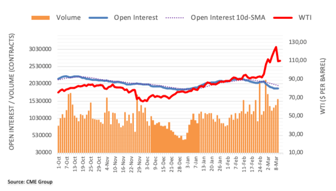 芝加哥商业交易所集团原油期货市场的初步数据显示,周二交易员增持其原油未平仓合约0.14万份。成交量增长约6.35万份合约,扩大此前增势。 WTI原油看起来受阻于130美元/桶 周二WTI原油价格再度上扬,同时未平仓合约和成交量齐增,表明油价仍可能进一步上涨。短期目标为2022年高点129.49美元(3月8日)。