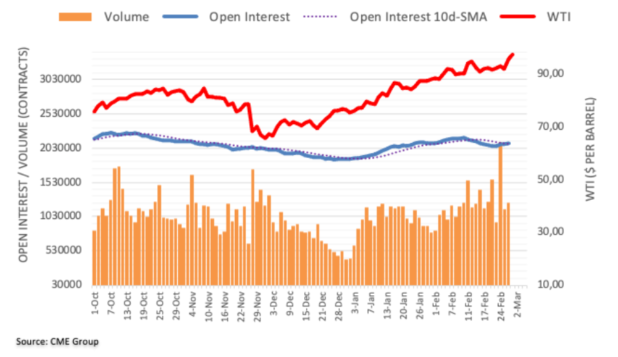 根据芝加哥商品交易所集团(CGrou)的原油期货市场初步数据,交易员周一未平仓头寸增加了近2000份合约,为连续第四个交易日增加。同时成交量上升约10.33万份,部分扭转了此前交易日的下降。 西德克萨斯中质油(WTI)将升至100.00美元及以上 周一,西德克萨斯中质油(WTI)价格温和上涨,同时未平仓头寸和成交量也在上升,