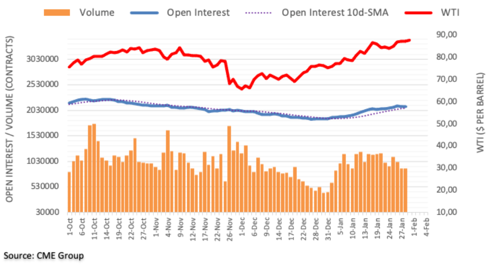 芝加哥商业交易所集团原油期货市场最新数据显示,周四交易员削减其未平仓合约0.58万份左右,此前连续三日下降。成交量连续第二日下降,此次下降约13.38万份合约。 WTI原油尝试在90.00美元下方盘整 周四WTI原油价格陷入盘整,同时未平仓合约和成交量齐跌。油价可能盘整,但在不久的将来油价可能会上涨至90.00美元的