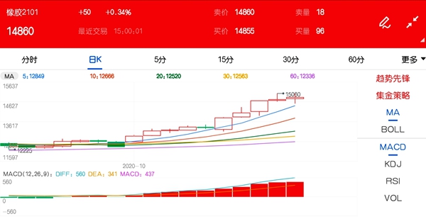 十月份以来,橡胶期货开启一波凌厉的上涨走势。主力2101合约涨幅一度高达20%。自12600元/吨附近起步,短短几个交易日一跃上破15000元/吨,昨日更是创下15060元/吨高位,为主连近三年最高水平。截至今日下午收盘时,2101合约稍有回落,收于14860元/吨,上涨0.34%。