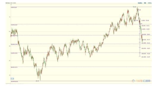 浪形结构分析,美国原油价格处于自67.95美元开启的下行第五浪中,五浪长度目前约为三浪的161.8%。三浪始于75.28美元,终于65.74美元。