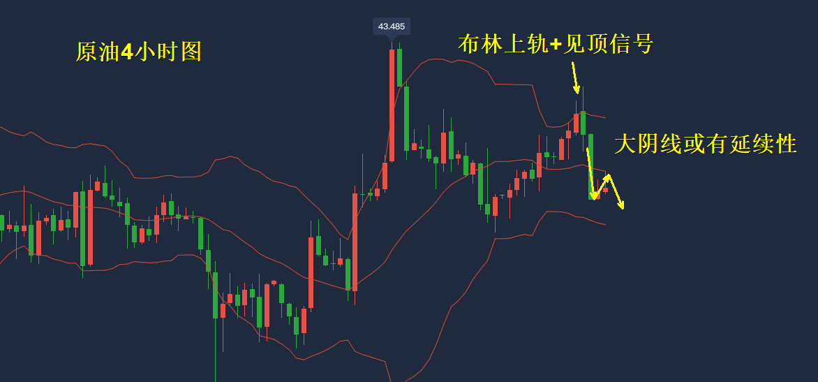 从4小时图上看,前期比较大幅度的拉升至布林线上轨,出现了见顶信号吞并,随后大阴线打落,四小时图的大阴线往往也比较具有延续性,所以日内可以考虑偏向逢高做空。