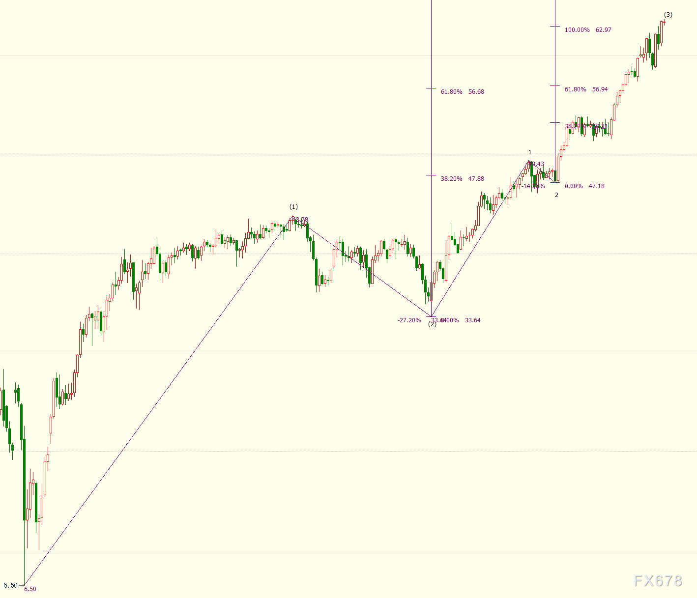 日线图上看,NYMEX原油自47.18美元开启的上行3浪走势,并升破100%目标位62.97美元,下一道阻力上看114.6%目标位65.28美元。3浪是自33.64美元开启的(3)浪的子浪。(3)浪的85.4%目标位在65.48美元。