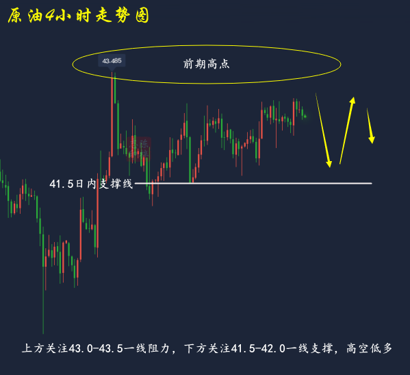 2.今日原油徘徊于上轨及5日均线之中,但顶部依然存在压力,上方继续还是关注43.0压力,从4小时上看,隔日原油短线刺破下轨后展开震荡上行回升,并在刺破上轨后小幅回落,但仍运行于5日均线之上,当前布林带处于开口期,MA均线走出双金叉,KDJ随机指标三线向下,MACD指标红色动能柱持续放量,快慢线平行向前,原油目前处于回落需求,但仍有上行趋势。