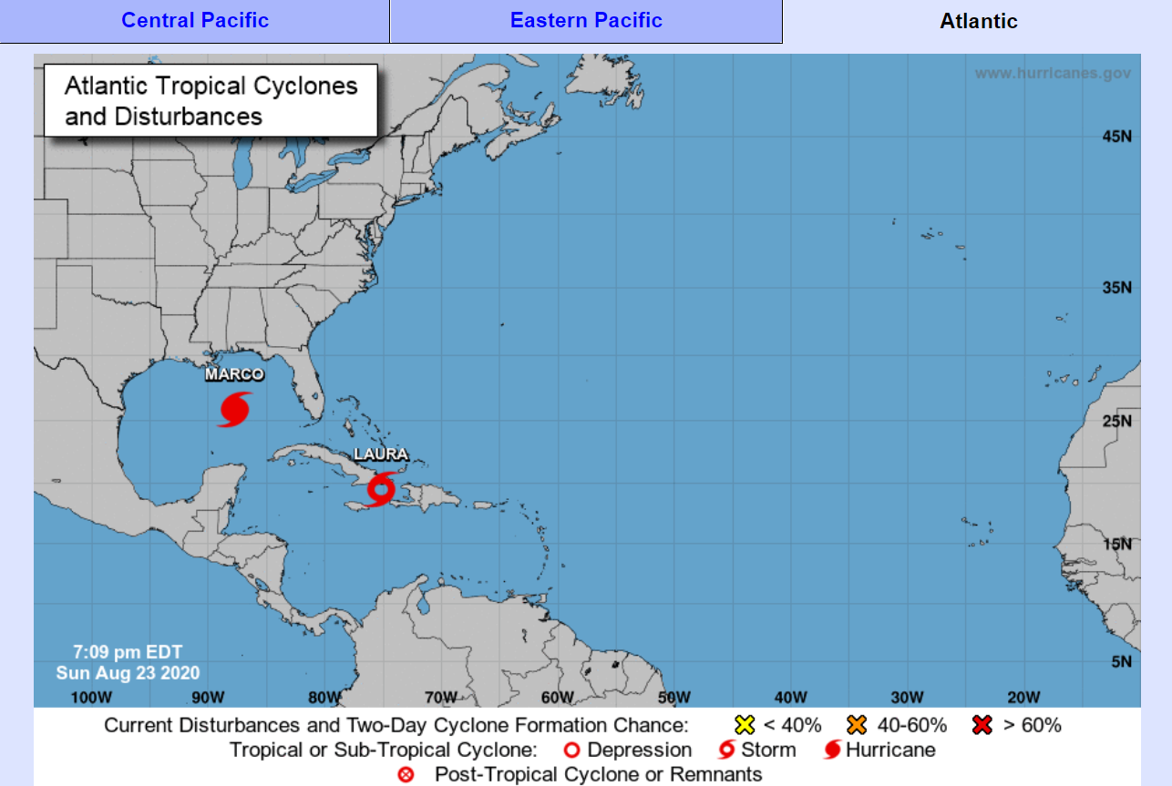据美国国家飓风中心,热带风暴“马尔科”已升级为飓风,将于当地时间周一登陆墨西哥湾沿岸,预计给墨西哥湾沿岸部分地区带来风暴潮和飓风级风力。热带风暴“劳拉”也在逐步接近,且风力略微增强,可能给多米尼加共和国、海地、古巴和牙买加带来大雨和洪水。