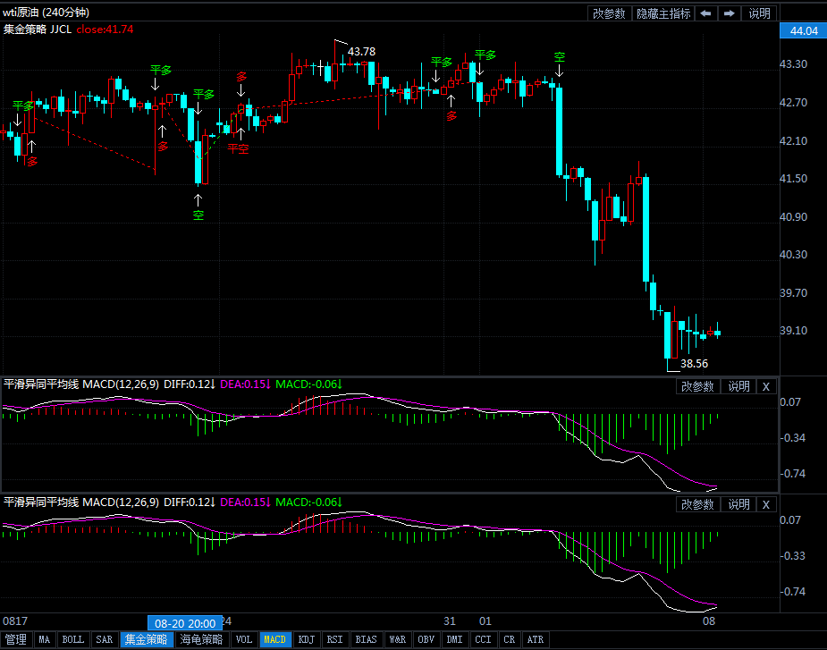 因沙特下调了10月份原油售价,同时由于全球燃料需求动荡迹象依然明显,近期原油价格持续疲软。国际油价周一盘中承压下挫,美国WTI原油期货价格盘中最低触及38.55美元/桶,日线图来看,MACD死叉、绿柱动能持续放量,KDJ死叉;布林带略微开口,油价连续第四个交易日走低并失守下轨,日线上看,隔日原油亚市盘中短线跳水后展开回升反弹,录得带上下影线的中阳,日线上,虽说原油隔日收阳,但均线压制性依旧较强,仍有下行风险;4小时上看,隔日原油亚持续低位震荡,当前布林带处于开口期,MA5日线有拐头向上趋势,KDJ随机指标三线向前,MACD指标绿色动能柱开始缩量,快慢线平行向前