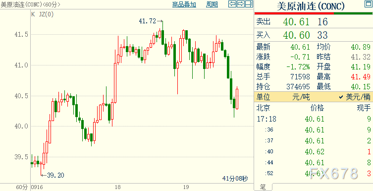 北京时间17:18,NYMEX原油期货下跌1.72%至40.61美元/桶;ICE布伦特原油期货下跌1.53%至42.49美元/桶。