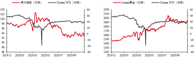 美国大选的不确定性大幅增加,特朗普对选情的大幅反转反应激烈,已在多个摇摆州发起诉讼,要求废止选举日后收到的邮寄选票。如果特朗普就选举程序、公正性等问题起诉至美国最高法院,最终裁定可能会旷延日久,将会压制原油在内的风险资产表现。即便是拜登当选,由于参议院大概率仍由共和党掌控,这一组合与民主党横扫相比,财政刺激的力度可能偏小(可能在5000至8000亿美元,而非此前2万亿),短期经济增长、通胀、美元指数、美债利率的上行动能也相对偏低,对于原油而言,需求增长相对偏弱一些,从中期角度,拜登胜选大概率增加伊朗产能释放,这一角度对油价影响偏空。