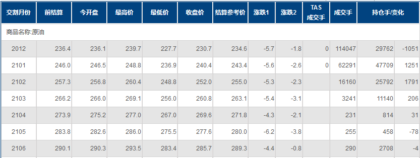 上海原油价格下跌。主力合约2012,以230.7元/桶收盘,下跌5.7元/桶,跌幅2.41%。全部合约成交196561手持仓量增加2169手至119265手。主力合约成交114047手持仓量减少1051手至29762手。
