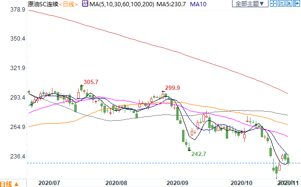 周五(11月6日)上海原油价格下跌。主力合约2012,以230.7元/桶收盘,下跌5.7元/桶,跌幅2.41%,盘中一度大跌3.68%!欧美疫情形势愈加严峻,令人对原油需求前景存疑,此外美国大选的计票工作仍在进行,最终结果仍悬而未决,令市场感到紧张。驻纽约瑞穗证券能源期货主任Bob Yawger表示,“随着天气逐渐转冷,情况可能愈加恶化,欧洲式封锁措施的威胁迫在眉睫”。美国大选计票与趋势表明共和党将取得参议院控制权,民主党将以微弱优势掌控众议院,打击大规模刺激计划的憧憬,这是打压油价的另一个因素。规模3万亿美元的拜登式协议不会出现了。