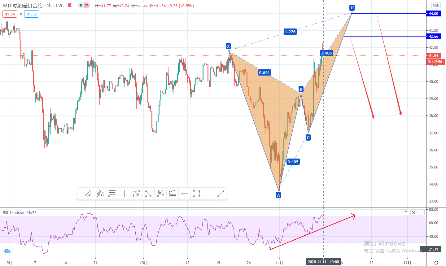 从指标来看目前RSI指标已经运行在了超买区,后市自然提示上涨空间有限,如果随着时间的推移指标成功的跌破了趋势支撑线,再配合原油价格运行至我们预期的价格,那还需要犹豫么?