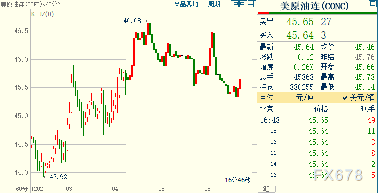 NYMEX原油期货下跌0.28%至45.64美元/桶;ICE布伦特原油期货下跌0.25%至48.67美元/桶。