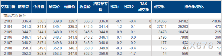 上海原油价格几乎持稳,主力合约2103终盘收于336.3元/桶,跌0.1元/桶,跌幅0.03%。