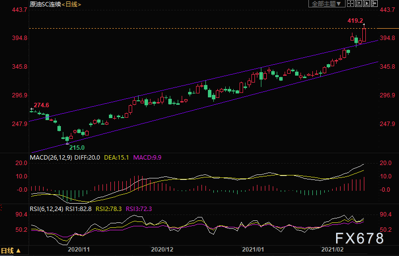 上海原油价格暴涨,创一年新高,主力合约2104终盘收于412.9元/桶,涨22.2元/桶,涨幅5.68%。