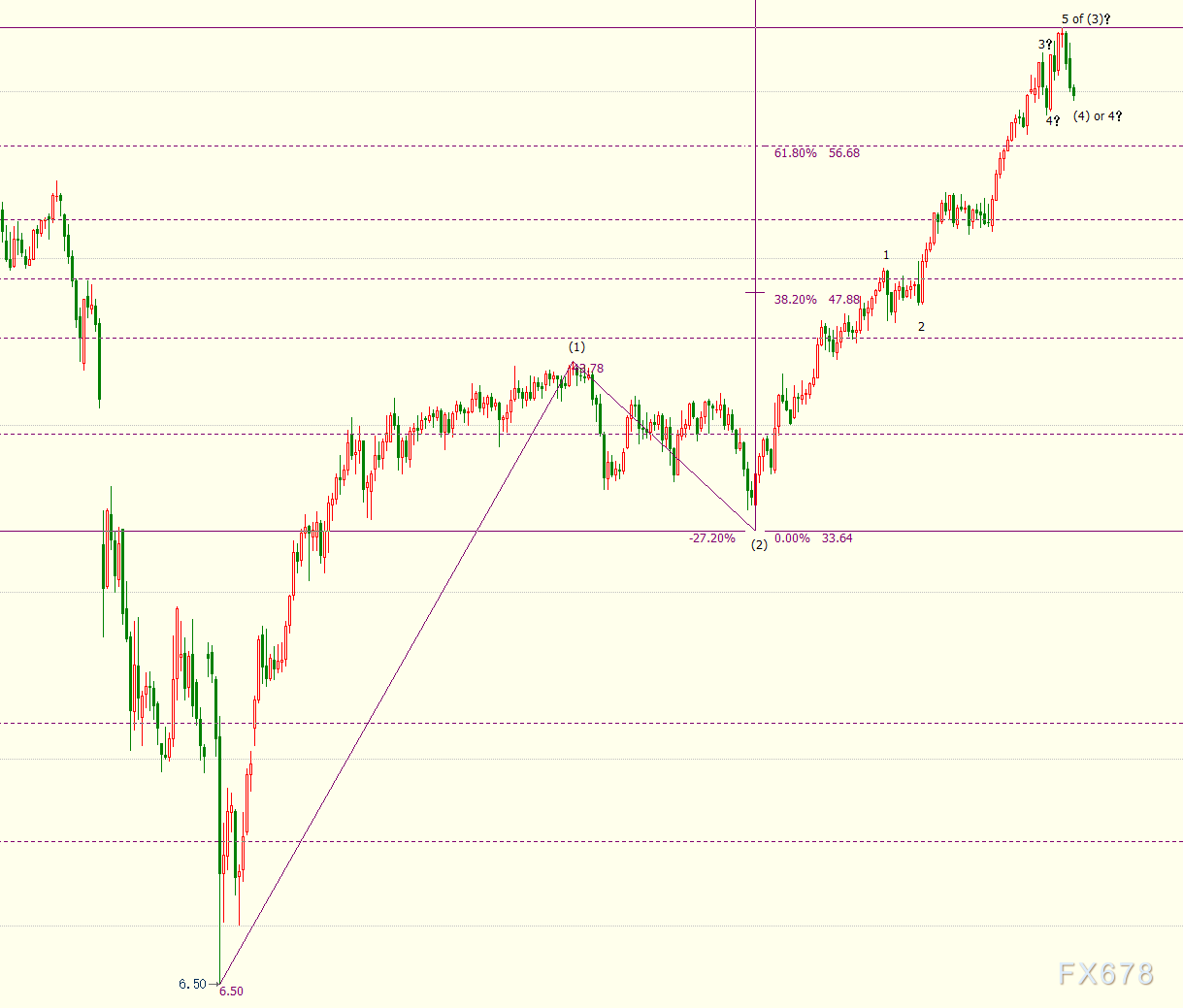 反之,若(3)浪势头不止,则油价将在短期内结束自63.81美元开启的4浪下行回调走势,4浪是(3)浪的子浪。上方阻力位进一步看向(3)浪85.4%目标位65.48美元和100%目标位70.92美元。