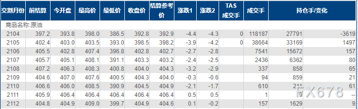 上海原油价格小幅下跌,主力合约2104终盘收于392.8元/桶,跌4.4元/桶,跌幅1.11%。
