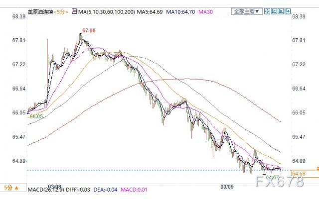 与此同时,ICE布伦特5月原油期货电子盘价格收盘下跌1.28美元,跌幅1.85%,报68.08美元/桶。
