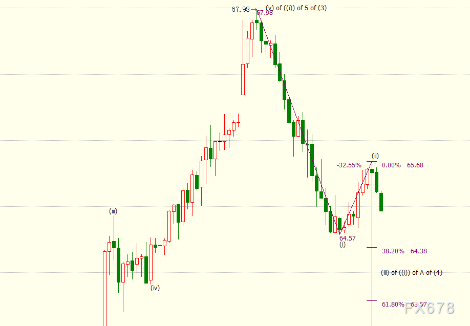 A浪料细分为((i))((ii))((iii))((iv))((v))五子浪。小时图上看,油价自65.68美元开启下行(iii)浪走势,近期支撑位下看38.2%目标位64.38美元和61.8%目标位63.57美元。(iii)浪是((i))浪的子浪。