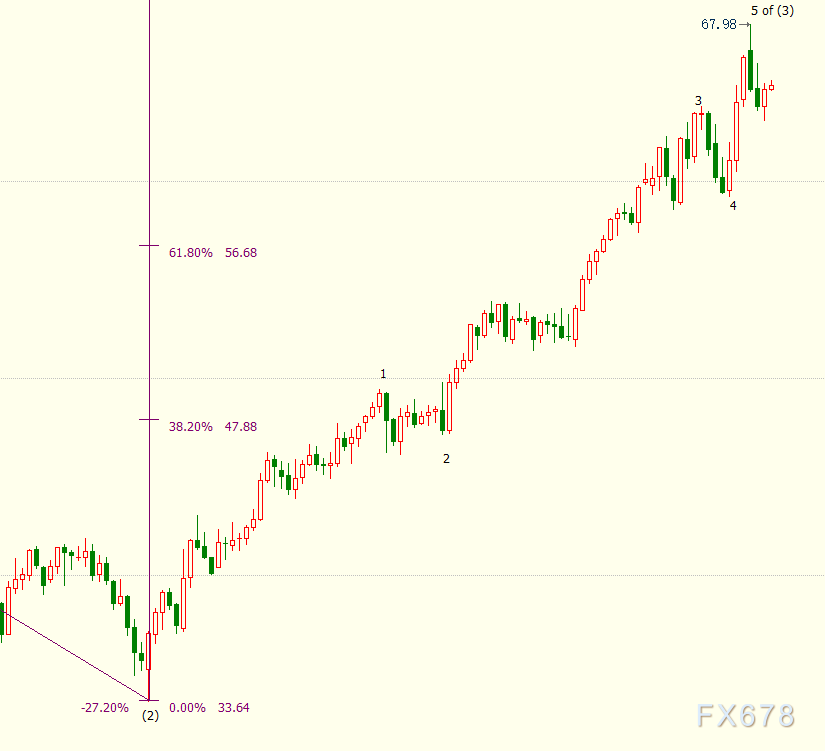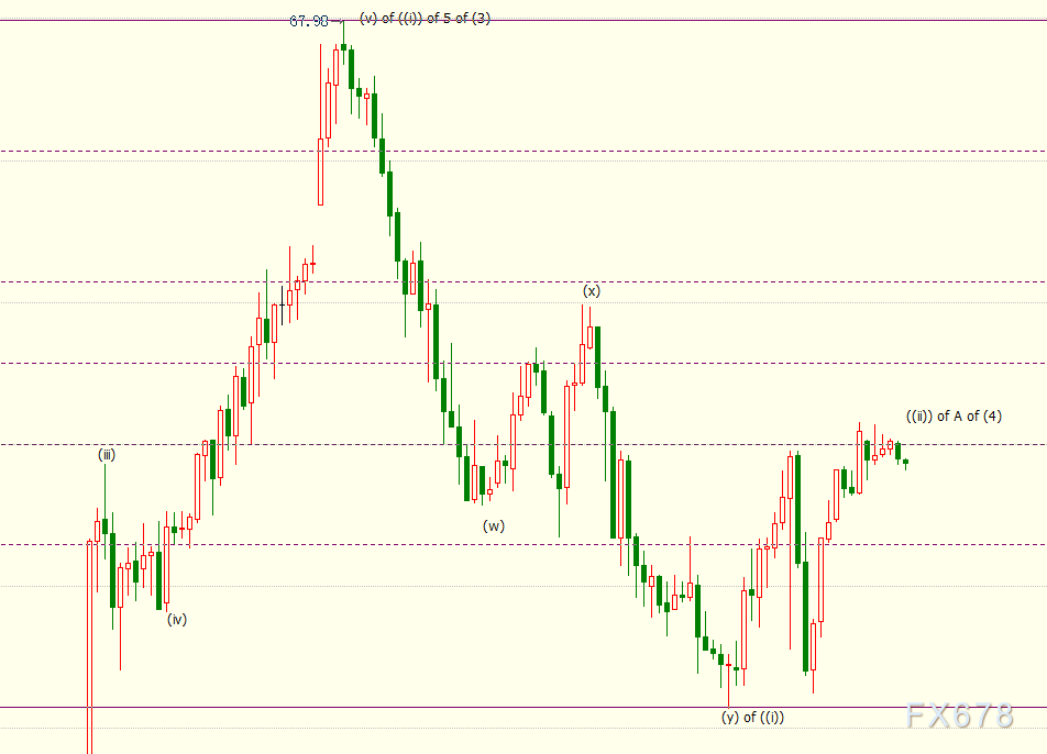 日线图上看,NYMEX原油或已在67.98美元结束自33.64美元开启的上行(3)浪走势,并开启回调(4)浪走势。(4)浪料由A、B、C三个一级子浪组成。