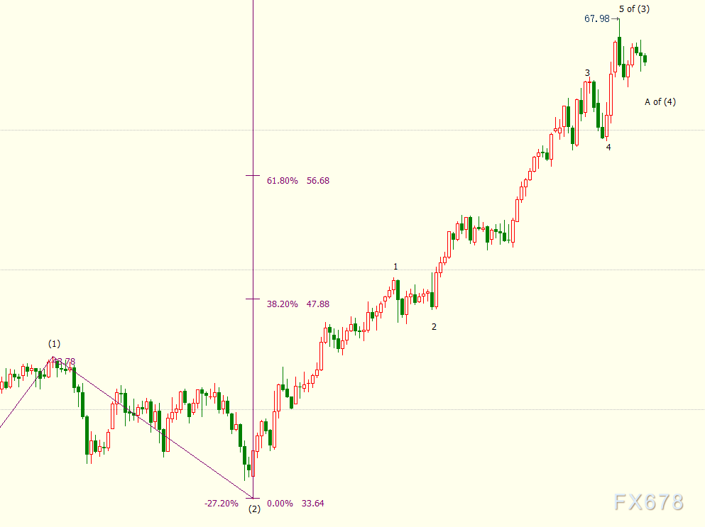 日线图上看,NYMEX原油或已在67.98美元结束自33.64美元开启的上行(3)浪走势,并开启回调(4)浪走势。(4)浪料由A、B、C三个一级子浪组成。