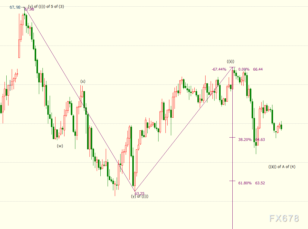 A浪料细分为((i))((ii))((iii))((iv))((v))五子浪。小时图上看,若油价自66.44美元开启下行((iii))浪走势,下方支撑看向23.6%目标位65.32美元和38.2%目标位64.63美元。
