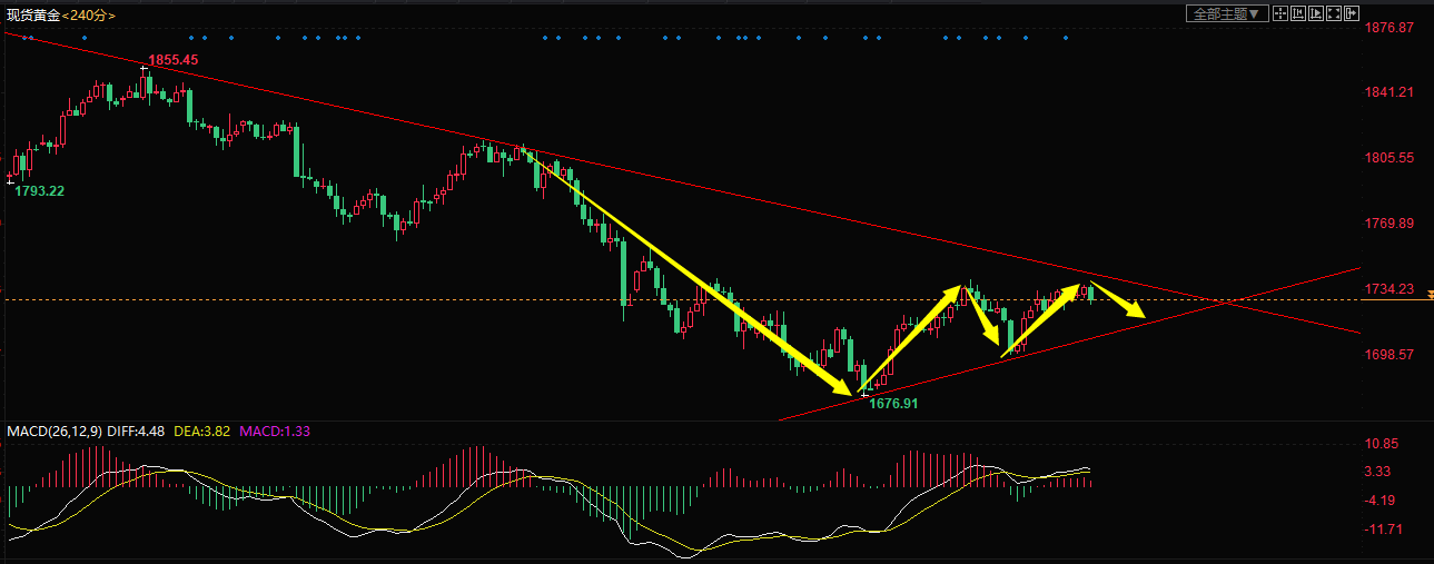 黄金刚刚跌破早间开盘价,激进者可以押注行情进一步下行,即现价(1732)做空,下方看至1714,止损1739