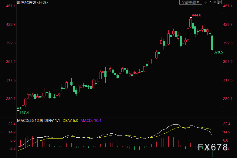 上海原油价格暴跌,主力合约2105终盘收于379.5元/桶,跌33.1元/桶,跌幅8.02%。