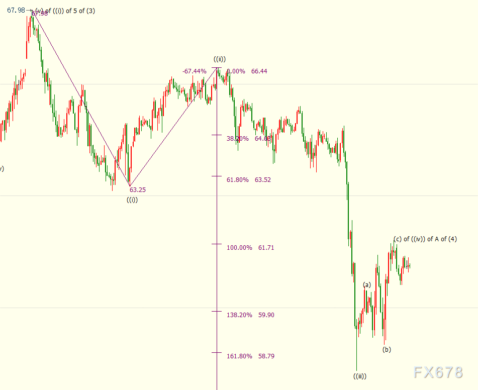 小时图上看,NYMEX原油料在61.80美元附近结束反弹((iv))浪走势,并开启下行((v))浪走势。((iv))浪和((v))浪都是自67.98美元开启的下行A浪的子浪。