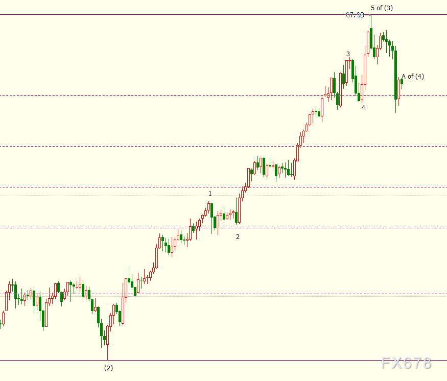 日线图上看,NYMEX原油已在67.98美元开启回调(4)浪走势,(4)浪料呈现ABC三子浪形态。A浪料跌向54.88美元,它是自33.64美元开启的上行(3)浪走势的38.2%斐波那契回档位。