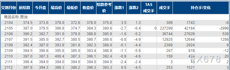 上海原油价格小幅下跌,主力合约2105终盘收于384.3元/桶,跌2.7元/桶,跌幅0.7%。