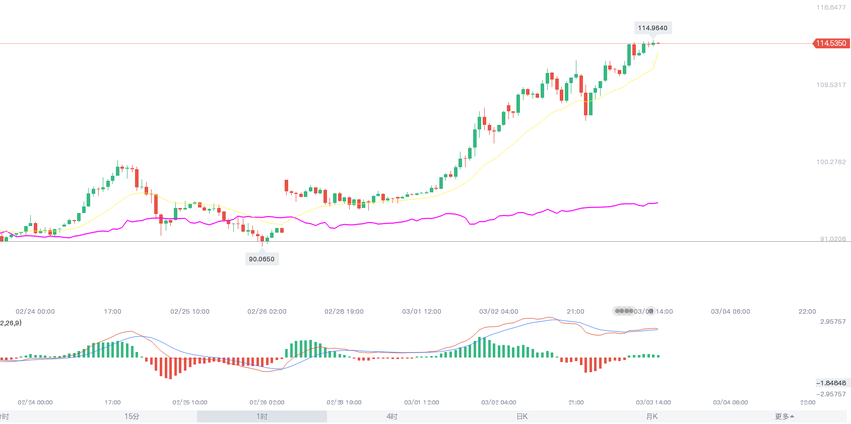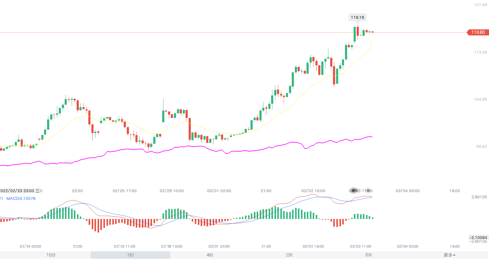 三月刚刚过去两天,国际油价就在不停的刷新高度。3月1日WTI原油价格大涨11.09%,收盘站上106.34美元,布伦特原油价格大涨9.88%,收盘站上107.65美元。3月2日国际油价延续涨势,WTI原油收涨4.7%,报112.83 美元,近十年来首次收盘站上110美元,布伦特原油收涨6.75%,报117.32美元/桶,自2008年以来首次站上115美元关口。在撰写本文时WTI原油突破115美元/桶,日内涨日内涨3.98% ,创2008年以来新高,布伦特原油日内大涨3.00%,最高触及118.18美元。