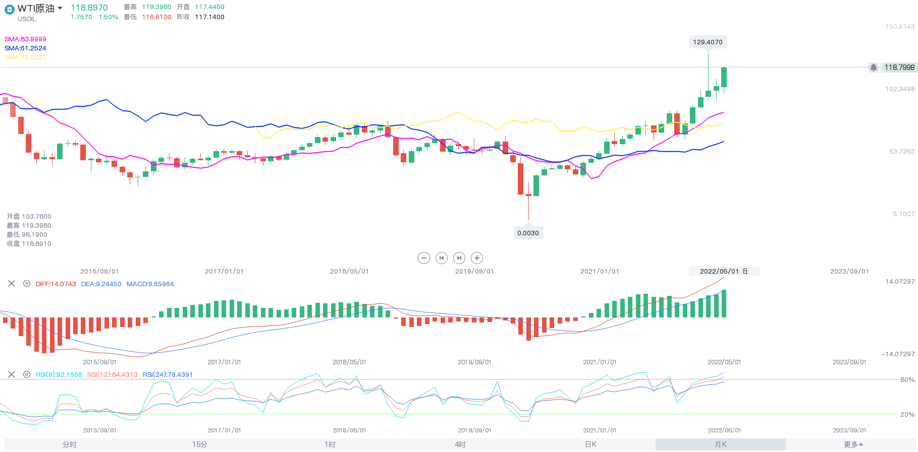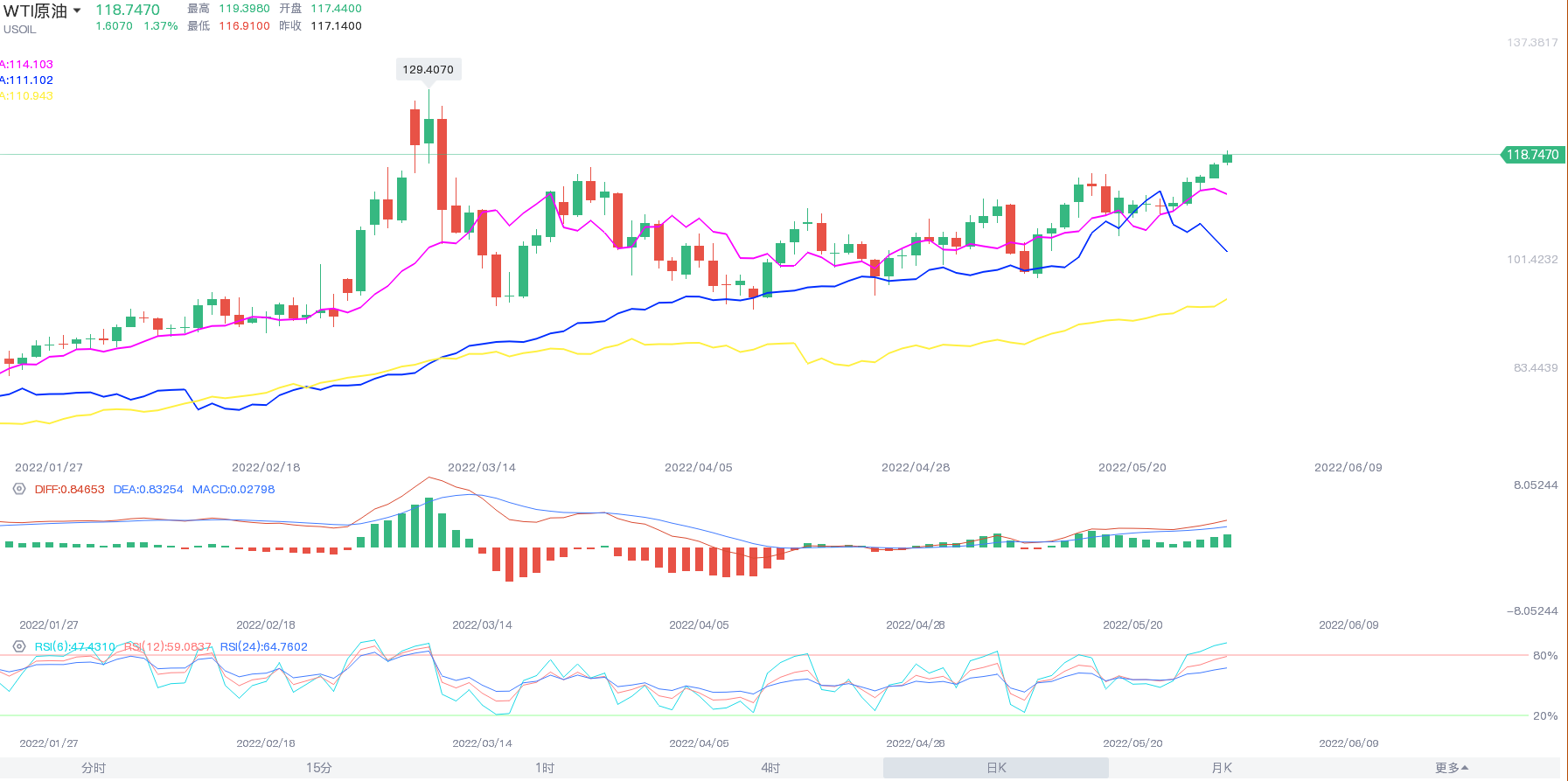 五月开盘103.78美元,最低98.19美元,今日5月最后一天,创下3月10日以来最高至原油站上119美元/桶,日内涨1.59%。5月以来,全球原油供需持续偏紧,叠加地缘政治溢价,国际油价持续上涨,近期油价已稳定在100美元/桶以上。