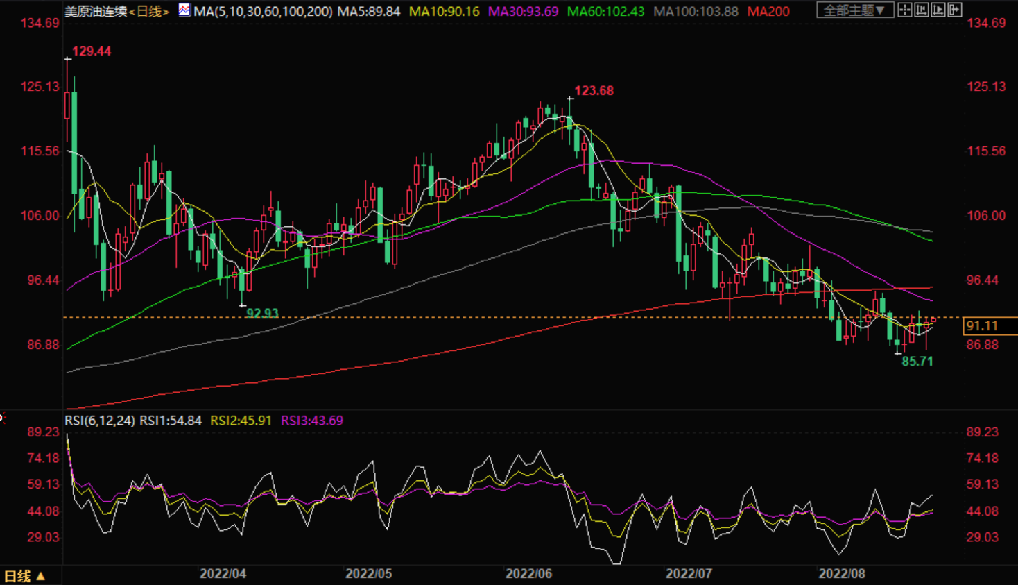 周二(8月23日)亚市盘初,美油现报91.11美元/桶;油价周一从盘中低点反弹,受益于市场权衡沙特关于OPEC+可能减产的警告,且CPC石油管道俄境内部分损坏致出口减少,市场也在评估伊核协议可能使受制裁的伊朗石油重返市场的可能性。