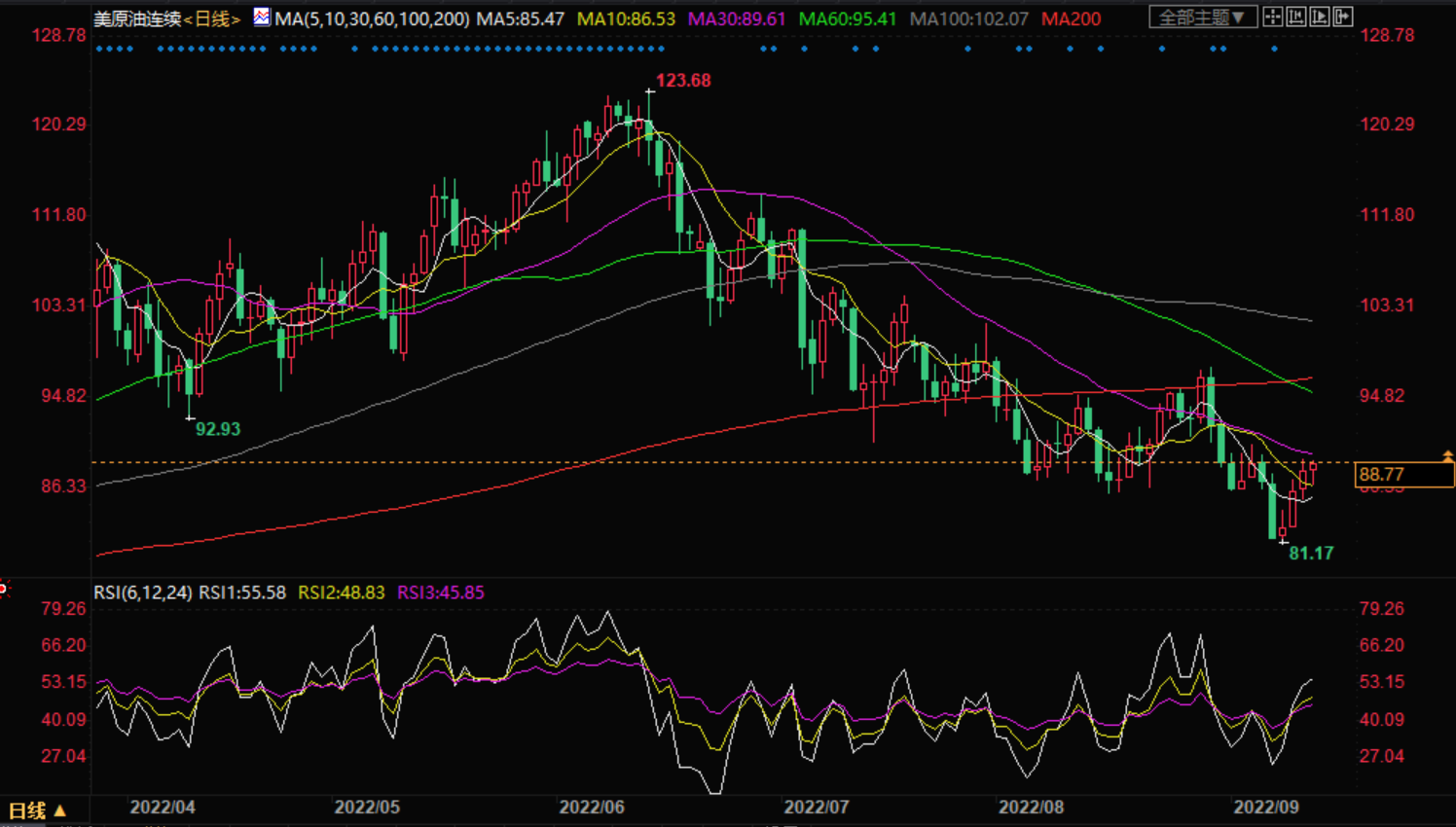 100移动平均线低于200移动平均线,表明阻力最小的路径是向下的,或者阻力水平更有可能守住而不是突破。然而,原油已经攀升到这两个移动均线之上,所以这两个移动均线可能是下跌时的动态支撑。