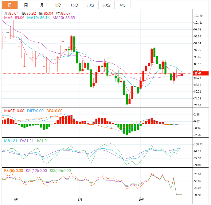 技术上,如果油价能够坚守布林线下轨82.92附近支撑,则后市多头仍有机会,目前布林线中轨阻力在85.02附近,布林线上轨阻力在87.12附近,该位置阻力相对较强,如果油价强势顶破该阻力,则增加后市看涨信号。