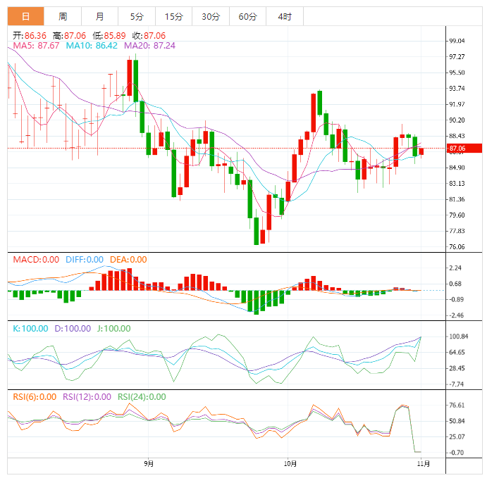 周二盘中,美油交投于87.00美元/桶附近;因油价周一下跌超2%,美国产量可能增加,疫情蔓延影响需求,沙特或于12月下调运往亚洲的原油价格也拖累油价。