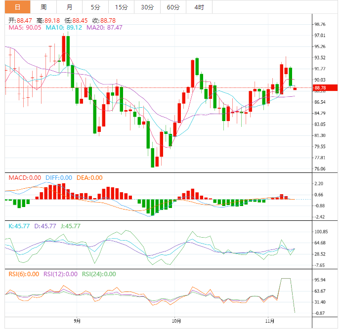 周三盘中,美油交投于88.78美元/桶附近;油价周二在震荡交投中下跌超3.5%,燃料需求的担忧不断加深,同时对美国期中选举结果也感到紧张;早间API数据显示美国库存猛增560万桶,关注晚间EIA数据。
