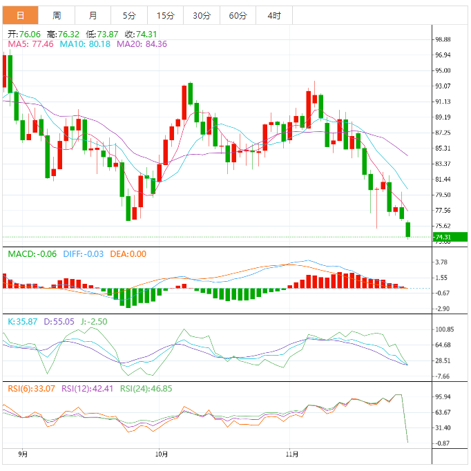 周一亚盘,油价跌至74.45美元,上周五下跌2%,市场交投清淡,这一周的交易主要受需求担忧和西方国家在俄罗斯石油价格上限的问题上讨价还价影响。Price Futures group的分析师Phil Flynn说,“因为假期后成交清淡,今天回吐了一些涨幅,” 在上周触及10个月低点后,这两份合约都将迎来连续第三周下跌。布伦特原油上周下跌4.6%,而美国原油则将下跌4.7%。