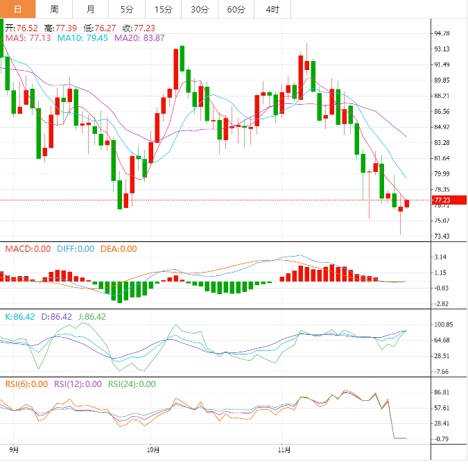 日线走势持续承压,短线走势偏弱运行,日内一波低开低走,刷新年内低点,走势上持续偏弱。但4小时级别线上一波大跌之后基本维持在低位窄幅震荡中,有收跌的迹象,现在不建议盲目去追空,行情出现一定的底部背离,短线行情可能需要一定的技术性的超跌反弹,可以试探做次多上去。综合来看,原油今日短线操作建议以回调低多为主,反弹高空为辅,上方短期重点关注78.7-79.2一线阻力,下方短期重点关注74.0-73.5一线支撑。